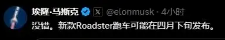 日前,马斯克在社交媒体上表示,特斯拉全新Roadster将于4月下旬发布。